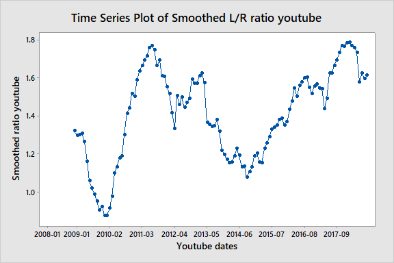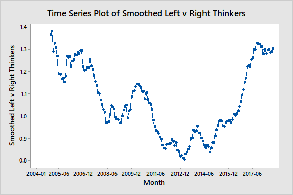 For ten thinkers- five left and five right: Marx, Kropotkin, Engels, Luxembourg and Bakunin versus Burke, Mises, Hayek, Rand and Chesterton I took the popularity level, relative to each thinker’s maximum popularity, at any given point in time between 2004 and 2018. I then took the median left-wing thinker popularity and the median right-wing thinker popularity (relative to their maximum) at any given moment and expressed it as a ratio of one over the other. The median was chosen because individual thinkers experience enormous fluctuation in interest due to new stories etc. It’s important to be clear that even more so than the other techniques, this approach cannot tell us who is winning, only what the best periods for each side are, and only then if our sample of thinkers is adequate. Here’s what I found: