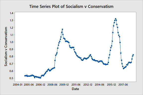 Interest in socialism has gone from about 50% of the level of interest in conservatism to about 80%