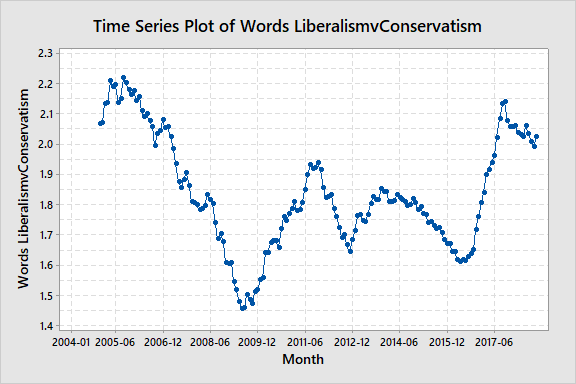 One of the complaints I’ve received about this post is that I didn’t consider Liberalism v Conservatism so here it is. The trend is in the same direction though it’s a little smaller: