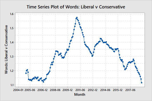 One of the complaints I’ve received about this post is that I didn’t consider Liberalism v Conservatism so here it is. The trend is in the same direction though it’s a little smaller: