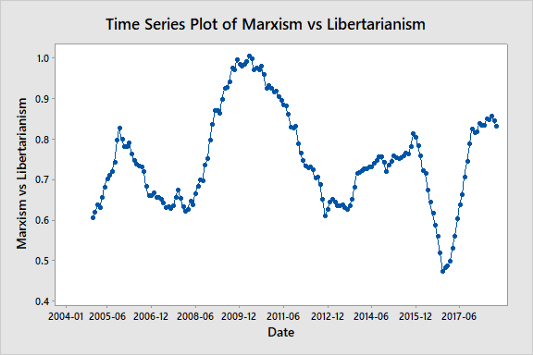 Marxism has gone from about 60% of the interest level of libertarianism to about 80%