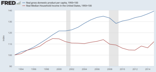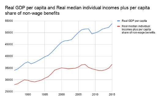 Sometimes a disconcerting graph is exactly what it looks like, and there’s no clever meta-contrarian story about how everything is really going fine. Over the period 1986–2015, the size of the economy per person grew by about 59%, whereas individual median salary income plus our estimate of non-wage compensation grew by about 31%.
